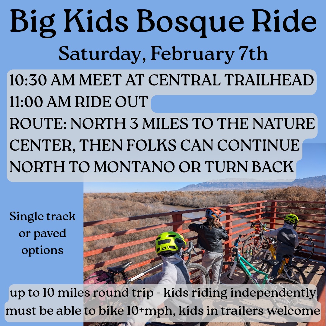 There's a small parking lot on the north side of Central, more parking options by Tingley beach, and the ART station is a block away for our multimodal friends. Friendly and kind adults are welcome to join this ride. We can stop at el vado after if folks are interested.